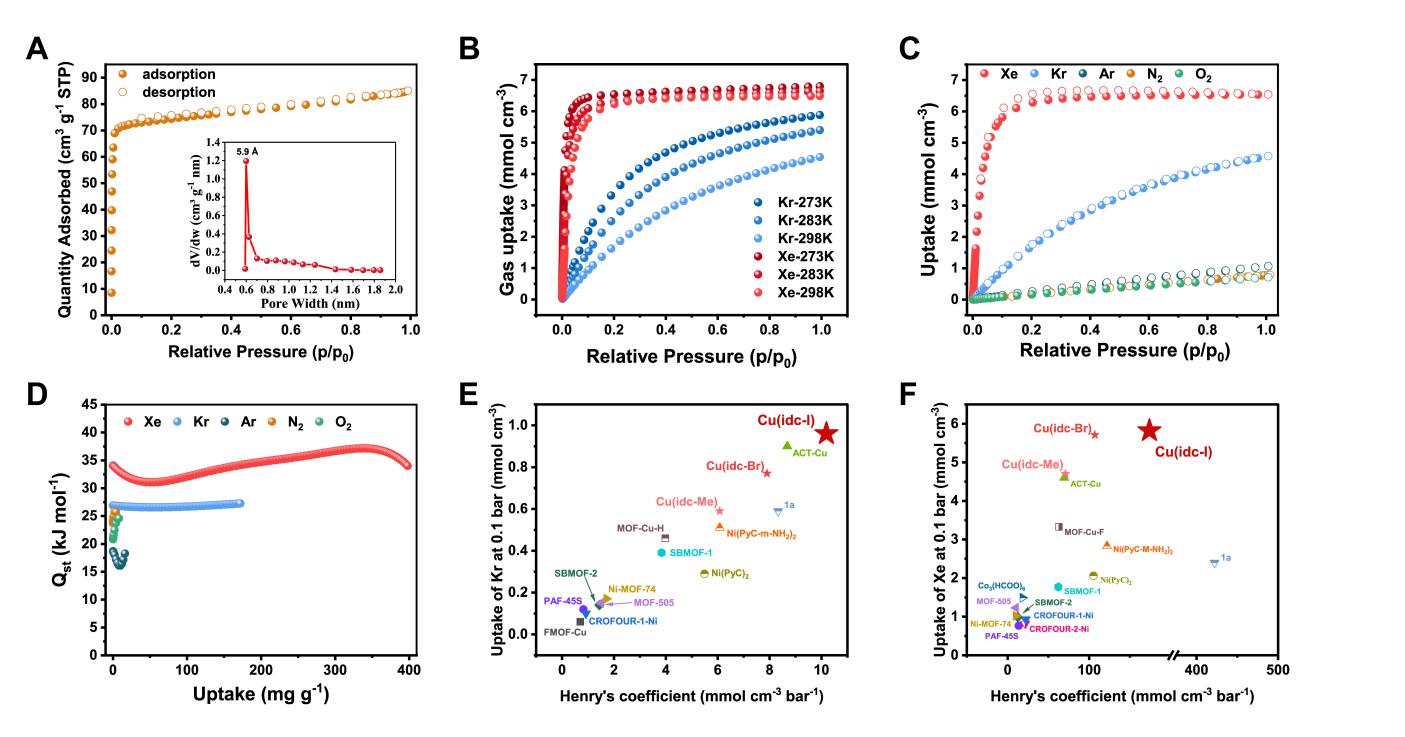 在乏核燃料后处理中,高效捕获放射性惰性气体氙(133Xe、135Xe)和氪(如85Kr)是实现放射性气态污染有效控制的关键。然而,惰性气体化学性质稳定,缺乏偶极矩和四极矩,无法形成强相互作用(如偶极-偶极作用或氢键),仅依赖微弱的范德华(vdW)力导致多孔材料对其吸附亲和力不足,削弱了从复杂的空气成分中有效捕获Xe/Kr的能力,使得在乏燃料后处理过程中有效捕获低浓度的Xe和Kr仍然是一个重要挑战。此外,决定吸附剂性能的关键结构参数尚未得到系统解析,进一步制约了高效吸附材料的设计与优化。