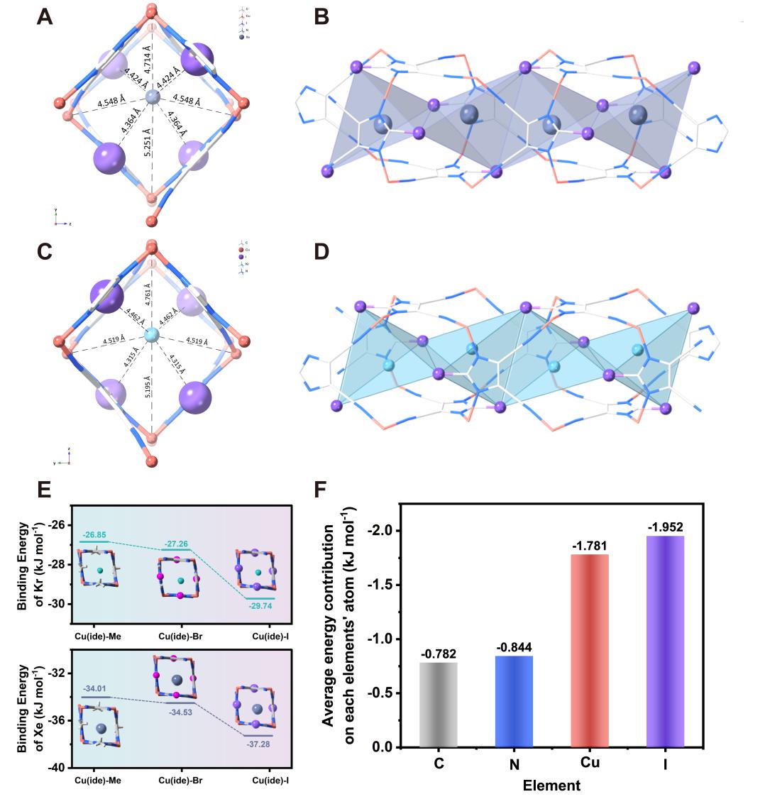 本研究基于“多重原子限域增强效应”设计理念,以金属有机框架材料为设计平台,以平面配位的梯形重原子碘代配体(碘原子为“头部”)和四面体配位的Cu+为金属节点(CuN4结构单元)自组装形成三维金属有机框架材料(Cu(idc-I))。单晶X射线衍射(SCXRD)结构解析显示梯形配体沿c轴头对尾排列,并在三维框架中交错取向,使在Cu(idc-I)中成功构筑全新的串联排列的纳米四面体碘笼。该四面体碘笼沿a轴的空腔尺寸约4.1 Å,与Xe(4.047 Å)和Kr(3.655 Å)的动力学直径高度匹配,可精确容纳单个惰性气体原子(图2)。