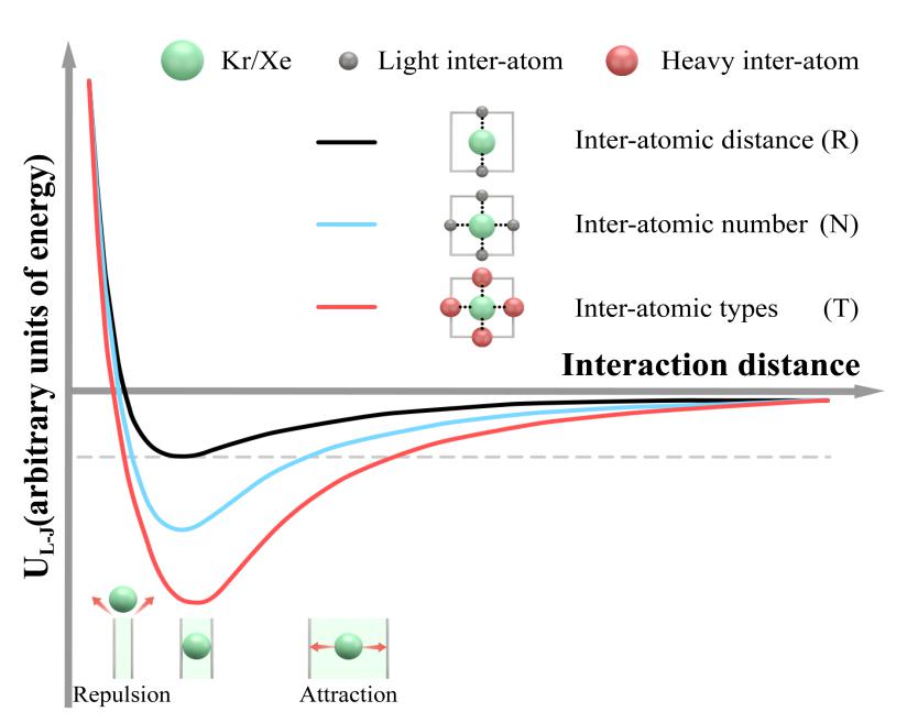 为了强化惰性气体(Xe/Kr)和主体(吸附剂)之间的vdW相互作用和全面解析吸附剂捕获Xe/Kr的结构参数,由王殳凹教授领衔的苏州大学放射化学研究团队基于Lennard-Jones (L-J) 12-6势理论,明确了影响吸附性能的关键参数(图1):原子间距(R)、作用原子数(N)和作用原子类型(T)。基于此,团队提出“多重原子限域增强效应”设计策略:通过在纳米限域空间中精准排布多个重原子,最大化vdW作用强度。