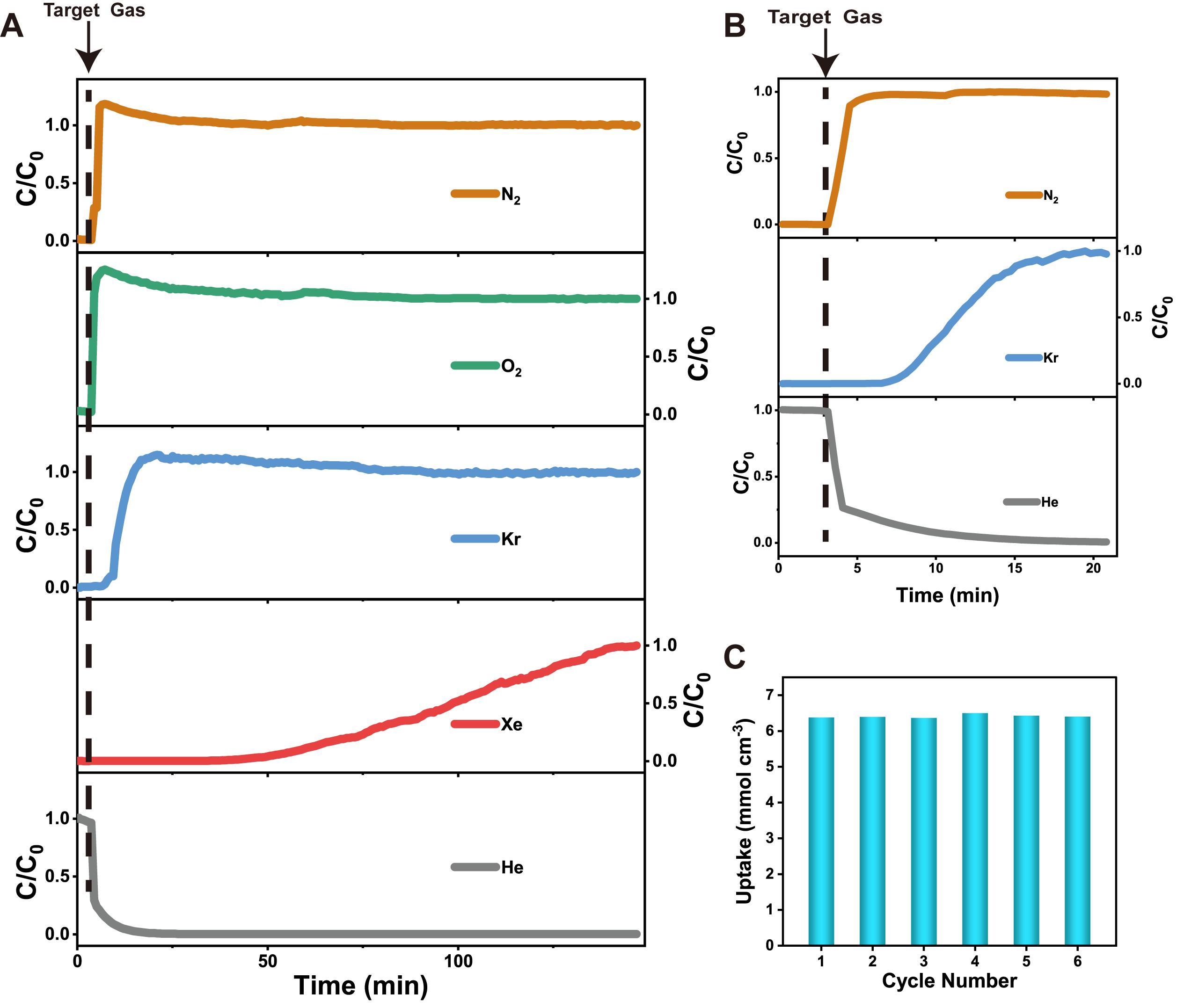 为验证Cu(idc-I)在乏燃料后处理中的实际应用潜力,本研究进行了动态柱穿透实验。结果表明,该材料对模拟废气中的Xe和Kr均表现出卓越的捕获性能:Xe吸附容量达48.93 mol/m³,Kr吸附容量达9.62 mol/m³(图5)。兼具优异的耐辐照性和热稳定性使Cu(idc-I)成为从乏燃料后处理的废气中捕获Xe和Kr的新型基准吸附剂。