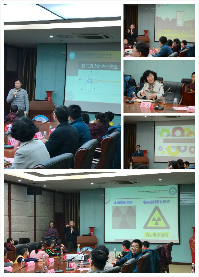 在热烈掌声中,学院党委书记、博士生导师曹建平教授,给孩子们介绍了学院的基本情况以及放射医学的相关知识。随后教工第二党支部书记、硕士生导师孙亮副教授和教工第一党支部委员朱巍副教授分别作了主题为“我们身边的辐射安全”和“医学检查中的辐射安全”的科普讲座。他们生动有趣地给孩子和家长们介绍了生活中辐射的来源与防护的基本方法,并结合医院里可能出现的辐射以及日常生活中手机、电脑和微波炉等常见源项的辐射,普及了防护知识。
