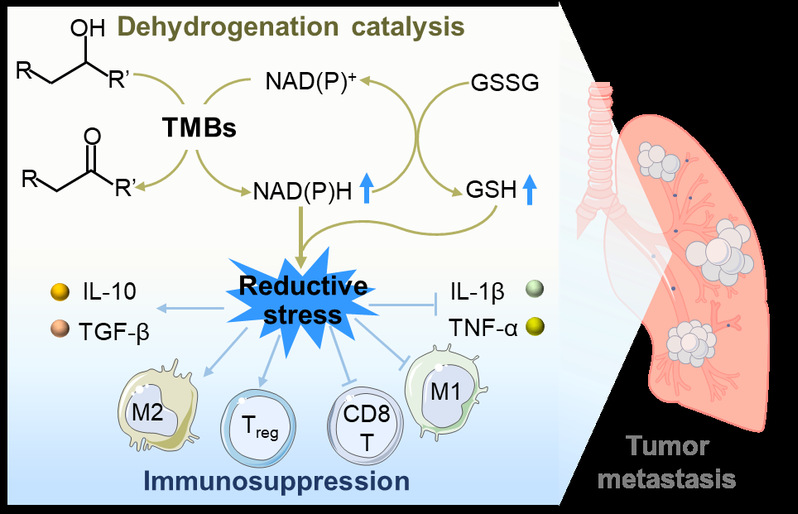 研究团队通过纳米材料库的高通量筛选,发现金属硼化物纳米材料能够模拟脱氢酶活性,加速细胞内关键的脱氢代谢反应,导致 NAD(P)H 和 GSH 等还原性分子的累积,从而引发细胞还原应激 (图1)。这一独特的生物效应可进一步诱导免疫抑制细胞因子的释放,促进免疫抑制细胞的分化,加剧肿瘤的转移。该研究提出了一种全新的还原应激触发方式,发现了“脱氢催化—还原应激—免疫抑制”的信号调控轴。该信号调控轴的发现突破了传统毒理学研究以氧化应激为核心的范式,为化合物及新材料的生物安全性评估提供了新的理论框架,也为免疫调控、肿瘤转移机制研究提供了新思路。