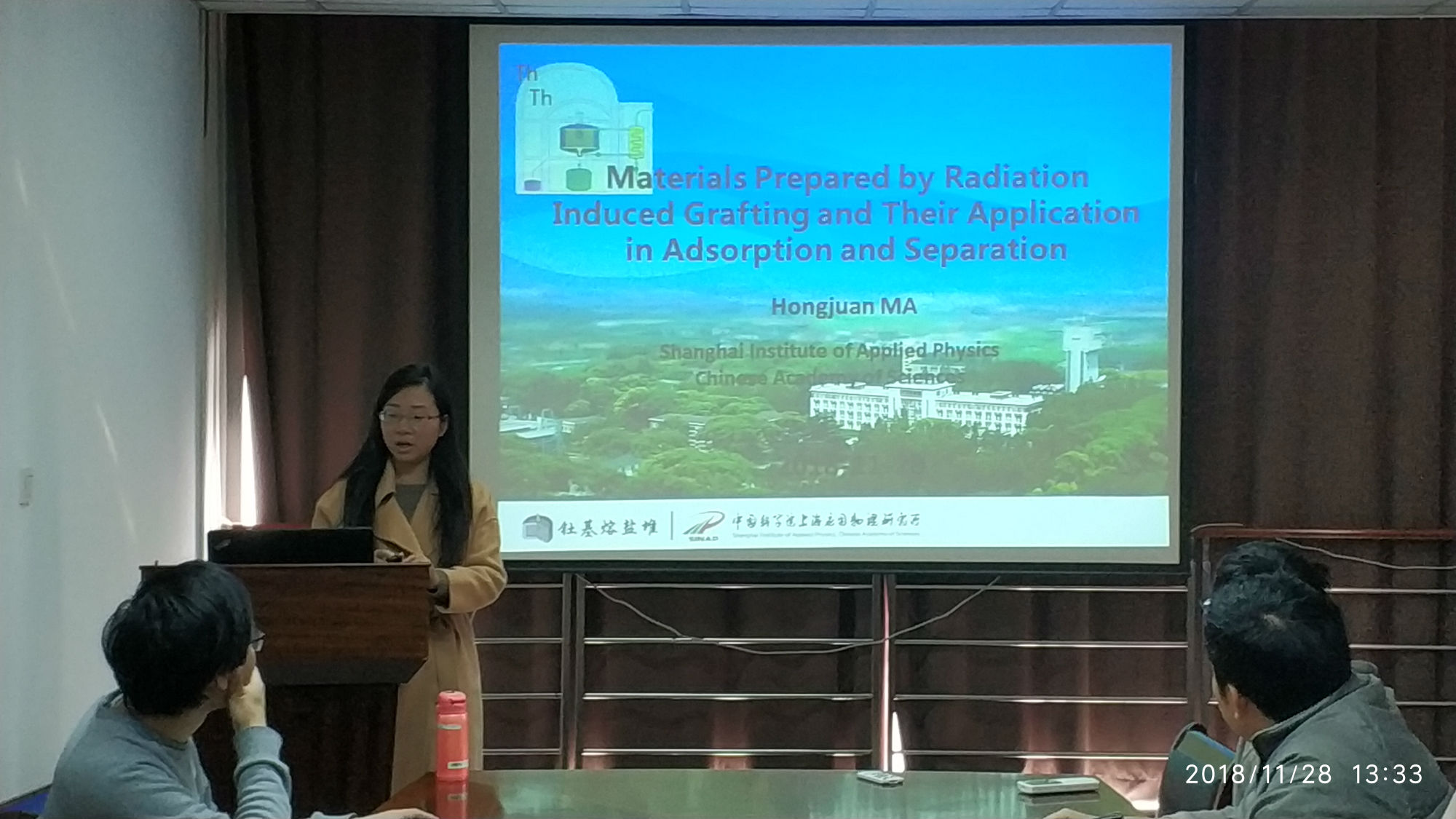 海洋为人类的生存和发展提供了大量不可或缺的资源,在能源危机亦步亦趋的当代,海水中储量丰富的铀资源将可能成为核能工业的巨大保障。然而海水中铀浓度极低,使得从海水中提取铀资源面临巨大挑战。1128日,中国科学院上海应用物理研究所马红娟副研究员应邀到我中心进行学术交流。马红绢副研究员以“Materials Prepared by Radiation Induced Grafting and Their Application in Adsorption and Separation”为题,向中心师生们介绍了她们在海水提铀的研究中所做出的努力和尝试。马红娟副研究员的报告内容丰富,解开了我们在海水提铀领域的一些疑惑,使得我们对海水提铀有了更充分的了解。
