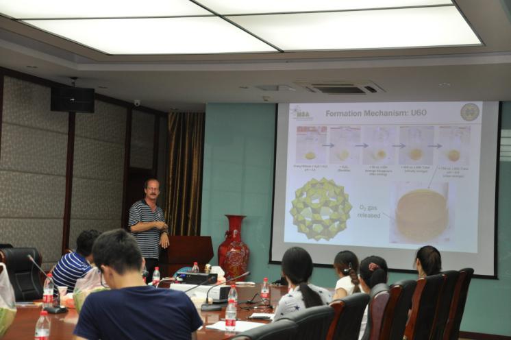 Peter Burns教授在铀团簇方面是国际上的权威,他的报告用诙谐的语言和动画详细地阐述了铀团簇的发现、设计合成、结构的解析以及铀团簇形成的机制和应用。他的报告引起了师生的强烈兴趣,大家就报告内容展开了热烈的讨论。报告结束后,王殳凹教授陪同Peter Burns教授参观了学院的实验平台,并介绍了核能环境化学研究中心在近年来的工作。