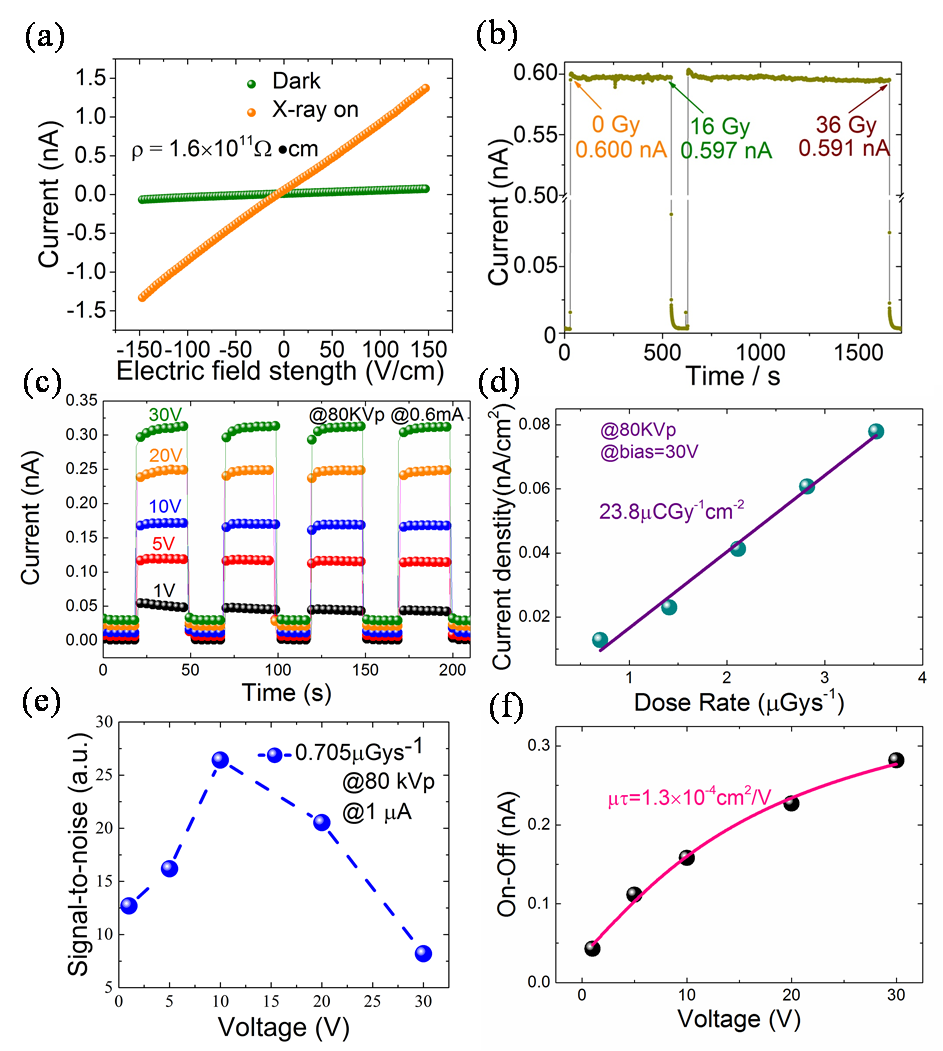 半导体金属有机框架材料是金属有机框架材料的一个新兴子课题,该类材料易于合成、其金属组分和有机组分极具设计性,具有功能和结构同时可调等多种优势。目前半导体金属有机框架材料已在催化、场效应晶体管、化学传感器等多个领域有所突破。然而,传统探测材料多为无机材料,由于本身的有机属性,这类材料能否与高能射线作用从而实现光电转化仍然未见报道。本工作提出了组装重金属与半导体配体,利用重金属吸收高能射线,半导体配体实现导电能力的思路。通过选择金属离子种类可逐步提高对硬X射线的吸收能力(图1a),设计合成了首个用于直接将高能X射线转化为电流的半导体辐射探测金属有机框架材料[(CH3)2NH2]Tb2L3(DMF)2(H2O)2(HCOO) (简称SCU-12, L = C6Cl2O42–)(图1b)。