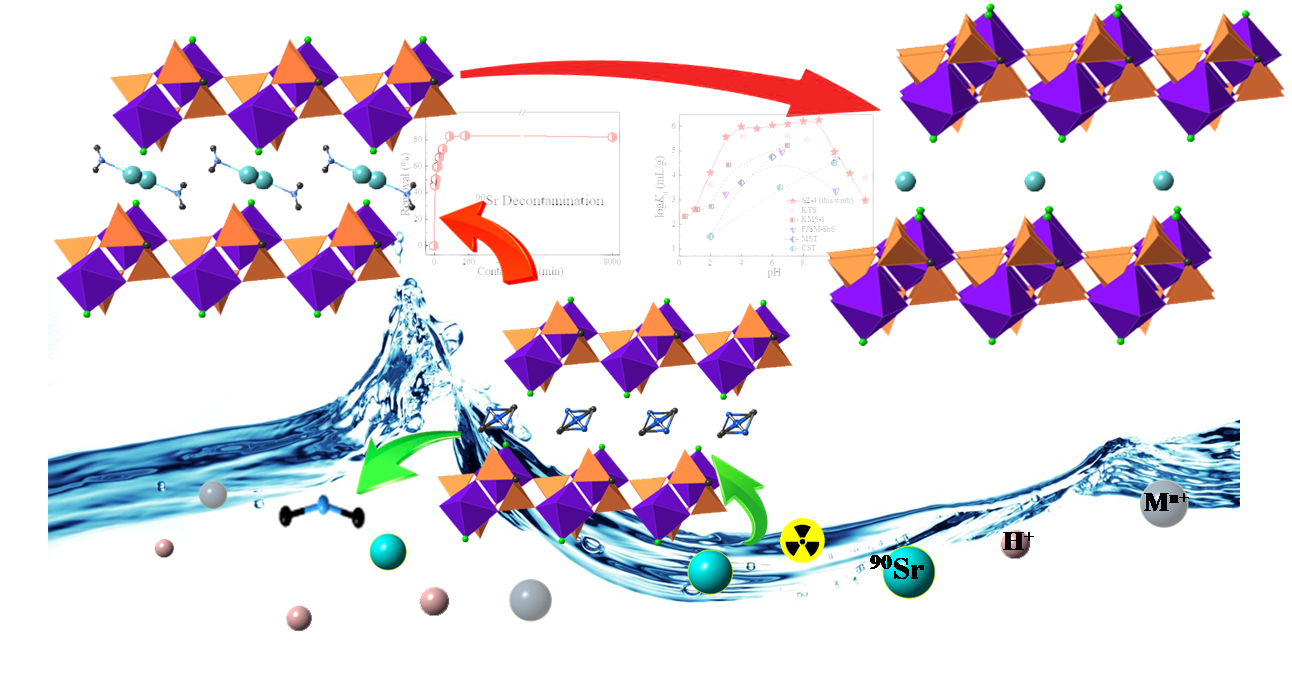 90Sr2+ remediation and separation from acidic nuclear waste solution and contaminated seawater have attracted a tremendous amount of public attention but significant challenges remain, mostly originating from the ion-exchange competition induced by a large excess of hard metal cations. Here, we report an atypical oxidic ion-exchange material SZ-4 that can effectively remove 90Sr2+ with record-high removal efficiencies in both acidic solution and seawater, where a distinctive two-step intercalation mechani** is directly visualized by single-crystal structures during an in situ Sr2+ sorption process, revealing a new type of uptake selectivity toward soft cations achieved through collaborative coordination by the oxidic layer and the dimethylamine interlayer as a soft N-donor ligand. These results shed light on designing a new generation of ion-exchange materials for radioisotope decontamination with practical applications.