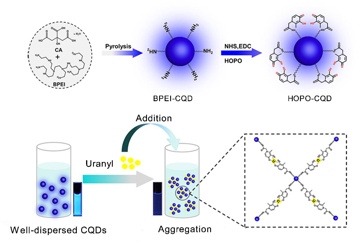 Although a variety of ****ysis techniques have been established and developed for uranium detection in aqueous solution, there is still an urgent need for a new technique that can be utilized for the on-site and instant monitoring of uranium concentration, particularly during a nuclear accident that requires an ultrafast response. Traditional ****ysis techniques suffer from the clear demerit of the relatively long time needed for an accurate detection. Herein, we report a solution to this challenge by developing a 3,4-hydroxypyridinone-functionalized carbon quantum dot (HOPO-CQD), which can be used as a fluorescent probe for the almost instant monitoring of uranyl ions. The developed probe exhibited an excellent sensitivity (limit of detection, 6.53 ppb), a high selectivity towards uranyl ions, and an extremely short response time (30 s). The excellent uranyl detection performance of the HOPO-CQDs originated from the strong and specific interaction between the HOPO ligand and the uranyl ion, leading to a unique uranyl-induced aggregation of the carbon quantum dots. This phenomenon is highly selective to uranyl ions and is attractive for further separation applications. This is the first time that post-modified CQDs are employed for the in situ, real-time detection of uranyl ions in aqueous solutions, with a promising potential for practical applications in the near future.
