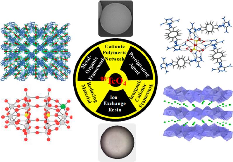 Technetium-99 (99Tc) is one of the most-problematic radioisotopes in used nuclear fuel owing to its intrinsic features of a high fission yield, long half-life, high environmental mobility, volatile nature during waste vitrification, and its redox interface capability with actinides during used fuel repossessing. The selective separation of pertechnetate (TcO4–) from legacy nuclear waste and contaminated natural water is therefore highly desirable but still a significant challenge, because the conditions of a strong radiation field, high ionic strength, high acidity/alkalinity, and large amounts of competing anions are often involved in these systems. Until now, there are a handful of functional materials that can efficiently remove TcO4– from nuclear waste solutions with high uptake capacities, fast kinetics, and good selectivity, but room still remains to further improve our capabilities for controlling the contamination/separation of TcO4–. In this Perspective, we discuss the current state of the art TcO4– separation materials including precipitation agents, reducing materials, ion-exchange resins, inorganic cationic frameworks, cationic metal–organic frameworks (MOFs), and cationic polymeric networks (CPNs) materials. The intriguing separation mechani**s of these materials for TcO4– are also disclosed, which may hopefully shed light on further development in this field.