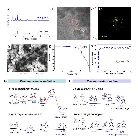 金属有机框架材料(MOF)是由金属中心和有机配体构筑形成的一类晶态多孔材料,具有高比表面积、固有孔道结构和高度可修饰性等优点,在工业领域有着广泛的应用。随着MOF材料应用的不断发展,高效、绿色合成MOF材料成为其工业化应用的核心问题。目前,MOF的合成方法包括溶剂热法、微波法、机械法、超声法、等离子体催化法等,且实现了少量MOF材料的批量化工业生产,但依旧存在反应流程繁琐、产率低、能耗高、难以批量化合成等问题。苏州大学放射化学研究团队在国际上率先开展了辐射化学合成晶态多孔材料的研究,在沸石分子筛(Angew. Chem. Int. Ed., 2021, 60, 14858-14863.)及共价有机框架材料(J. Am. Chem. Soc. 2020, 142, 20, 9169-9174.)中已经取得一系列前期研究成果,有望解决晶态多孔材料批量化工业生产的难题。
