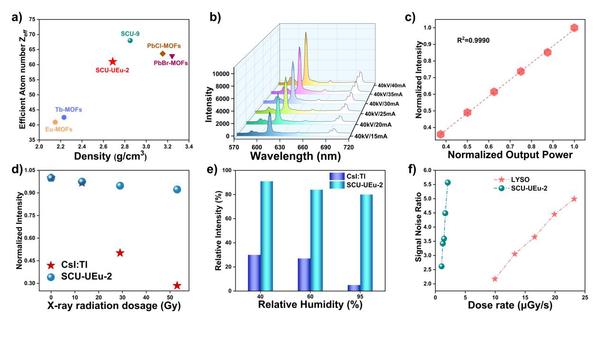图3. a) MOFs闪烁体的密度和有效原子序数比;b) SCU-UEu-2的X-射线激发的荧光光谱;c) SCU-UEu-2的X-射线荧光强度与输入能量的线性关系;d) 不同剂量下SCU-UEu-2和CsI:Tl的光输出能力;e) 不同湿度下SCU-UEu-2和CsI:Tl的光输出能力;f) SCU-UEu-2和LYSO对于X-射线的检测下限。