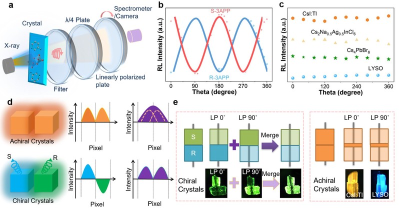 图1 a.实验室搭建的手性辐射测试装置; b.新型闪烁体的偏振辐射荧光特征; c.传统闪烁体的辐射荧光特征; d. 手性闪烁体用于减少光串扰概念示意图; e. 不同结构闪烁体成像的边界效应比较。