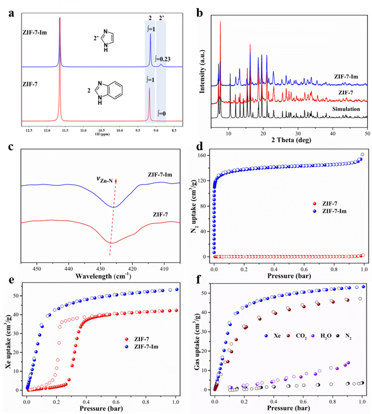图2. ZIF-7-Im中Im成功取代的系列表征以及取代后结构与原始ZIF-7之间在气体吸附行为上的对比