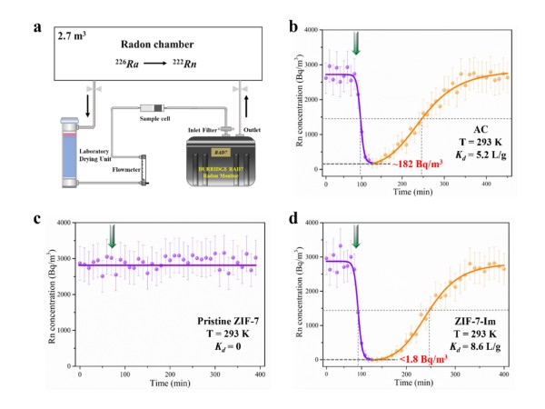 图3. Rn穿透实验的示意图模型及椰壳活性炭、原始ZIF-7以及ZIF-7-Im三种材料的Rn穿透实验结果